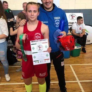 Helene Berg (13) var først ut, og var nok litt spent for å debutere i schoolbox (ordinær boksing) allerede som 13-åring. Hun trakk direktefinale lørdag hvor hun møtte irsk motstand, Rebecca Finucane. Helene har mange diplomkamper i sekken, i tillegg til at hun har forberedt seg godt til dette. Hun bokser teknisk meget godt, og stopper kampen allerede i første runde. Vi gratulerer Helene med seier i sin første ordinærkamp/schoolbox. GULL!